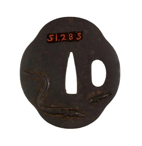 Keywords: Japanese - Tsuba with Sea Creatures - Eel, Flying Fish, Spiny Lobster, and Octopus - Walters 51285 - Back.jpg Various sea creatures crafted in different metal alloys are depicted on this tsuba Along the upper right edge is a spiny lobster which is often used as a symbol of longevity At the lower right is a flying fish An octopus occupies the lower left On the reverse are an eel and another fish along the lower edge date iron copper gold silver shakudo cm 6 33 5 69 0 55 accession number 51 285 32756 Henry Walters Baltimore date and mode of acquisition unknown Walters Art Museum Henry Walters Acquired by Henry Walters none place of origin Japan Walters Art Museum license Tsuba in the Walters Art Museum Media contributed by the Walters Art Museum needs category review