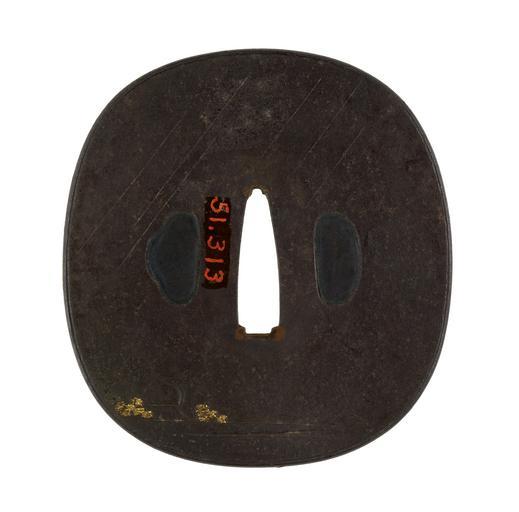 | Keywords: Japanese - Tsuba with a Tea-leaf Harvester Caught in a Rainstorm - Walters 51313 - Back.jpg Flying through the sky at the top of this tsuba is a dragon At the bottom a man with a basket a kettle and a sickle runs through rain at the water's edge Rain is depicted through incised lines On the reverse rain is shown at the upper left with a hint of landscape at the bottom This may be a reference to a legendary story date iron copper gold shakudo gilt cm 8 28 7 68 0 4 accession number 51 313 19696 Henry Walters Baltimore date and mode of acquisition unknown Walters Art Museum Henry Walters Acquired by Henry Walters none place of origin Japan Walters Art Museum license Tsuba in the Walters Art Museum Media contributed by the Walters Art Museum needs category review |