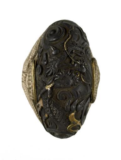 Keywords: Japanese - Tsuka with Dragons, Clouds, and Mt Fuji - Walters 5112813B - Detail A.jpg The kashira on the end depicts a dragon amongst clouds with gold highlights One of the menuki is in the shape of a gold dragon flying through shakudo clouds The other depicts Mt Fuji The pairing of a dragon and Mt Fuji is an emblem of success This is part of a mounted set century 18 19 late Edo-Meiji silver ray skin gold shakudo cm 12 2 accession number 51 1281 3B 2350 Henry Walters Baltimore date and mode of acquisition unknown Walters Art Museum Henry Walters Acquired by Henry Walters none place of origin Japan Walters Art Museum license Tsuka in the Walters Art Museum Media contributed by the Walters Art Museum needs category review Media contributed by the Walters Art Museum needs artist review |