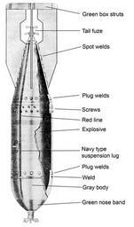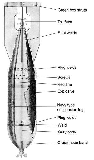Keywords: Japanese Type 98 No 25 land bomb.jpg A diagram of a Japanese Navy World War II Type 98 No 25 532 lbs Land bomb Diagram scanned from TM 9-1985-4 Japanese Explosive Ordnance Before March 1953 US Gov Public domain - US gov PD-USGov Japanese WW2 Air-dropped bombs Weapons of the Imperial Japanese Army |