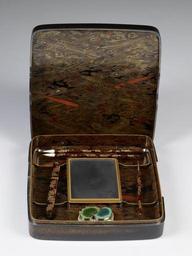 | Keywords: Japanese - Writing Box and Implements (suzuri bako) with a Pheasant Beside a Stream - Walters 6775 - Open B.jpg Implements inside the box A rectangular inkstone with a depression for water is positioned in the center of the box On the right side are brushes and a stylus while on left is an encased knife used to cut paper The enamel piece above in the shape of hollyhock leaves is a water-dropper An ink stick sumi would have been included in the set The sumi is a small stick of solid ink that is turned into usable ink by grinding it on the inkstone and adding water Lid with pheasant beside a stream The inlaid silver Japanese text on the lid is a partial line from a poem in Lady Murasaki Shikibu's early 11th-century novel The Tale of Genji In chapter 29 The Royal Outing the emperor invites Genji to go hunting in the mountains outside Kyoto Genji sends his regrets that he cannot join the royal party The emperor decides to send Genji a couple of pheasants with the following poem attached Deep in the snows of Mount Oshio Are ancient pheasants' tracks Would that you might see them The box makes a poignant reference to this classical poem as it holds the tools of a poet century 18 19 Edo; Meiji box wood lacquer silver mother-of-pearl gold; paint brushes wood lacquer animal hair; water dropper silver enamel; stylus wood lacquer steel; knife wood lacquer steel; ink stone slate Lid cm 2 54 21 27 22 86 ; Bottom cm 3 81 21 27 22 86 accession number 67 75 21270 Henry Walters Baltimore date and mode of acquisition unknown Walters Art Museum Henry Walters Acquired by Henry Walters Japanese Lacquers The Walters Art Gallery Baltimore 1984 place of origin Japan Walters Art Museum license Art of Japan in the Walters Art Museum Suzuri bako |