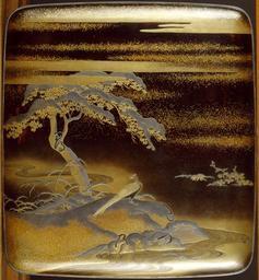 Keywords: Japanese - Writing Box and Implements (suzuri bako) with a Pheasant Beside a Stream - Walters 6775 - Top (2).jpg Implements inside the box A rectangular inkstone with a depression for water is positioned in the center of the box On the right side are brushes and a stylus while on left is an encased knife used to cut paper The enamel piece above in the shape of hollyhock leaves is a water-dropper An ink stick sumi would have been included in the set The sumi is a small stick of solid ink that is turned into usable ink by grinding it on the inkstone and adding water Lid with pheasant beside a stream The inlaid silver Japanese text on the lid is a partial line from a poem in Lady Murasaki Shikibu's early 11th-century novel The Tale of Genji In chapter 29 The Royal Outing the emperor invites Genji to go hunting in the mountains outside Kyoto Genji sends his regrets that he cannot join the royal party The emperor decides to send Genji a couple of pheasants with the following poem attached Deep in the snows of Mount Oshio Are ancient pheasants' tracks Would that you might see them The box makes a poignant reference to this classical poem as it holds the tools of a poet century 18 19 Edo; Meiji box wood lacquer silver mother-of-pearl gold; paint brushes wood lacquer animal hair; water dropper silver enamel; stylus wood lacquer steel; knife wood lacquer steel; ink stone slate Lid cm 2 54 21 27 22 86 ; Bottom cm 3 81 21 27 22 86 accession number 67 75 21270 Henry Walters Baltimore date and mode of acquisition unknown Walters Art Museum Henry Walters Acquired by Henry Walters Japanese Lacquers The Walters Art Gallery Baltimore 1984 place of origin Japan <gallery> File Japanese - Writing Box and Implements suzuri bako with a Pheasant Beside a Stream - Walters 6775 - Top jpg </gallery> Walters Art Museum license Art of Japan in the Walters Art Museum Suzuri bako