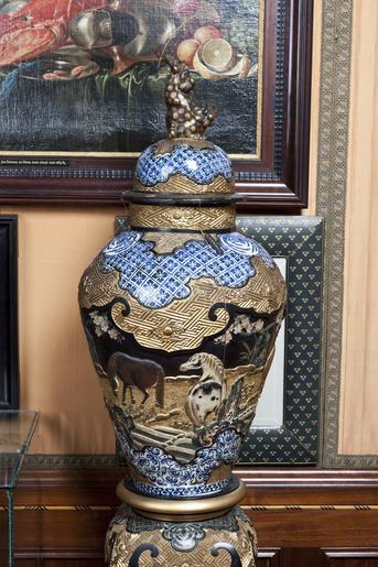 | Keywords: Japansk urna, aritaporslin, cirka 1700 - Hallwylska museet - 99446.tif  LSH artwork sv URNA två stycken med lock Päronformiga med lock På locket en på frambenen stående hund Dekor dels av landskap med hästar dels med gallerverk i guld samt inslag av blå glasyr i rutmönster Urnornas ställ med liknande dekor Benens avslut i form av klövar <br/>Inköpta 1896 hos konstahandlare H Bukowski Stockholm Pris 2 000 Kr <br/>Enligt uppgift av H Bukowski har urnorna tillhört kung Carl XV 1826-1872 och av Carl Adolf Sterky inköpts på auktion efter Carl XV därefter såldes de till H Bukowski <br/>Pair of large porcelain jars and lids decorated with moulded relief lacquer underglaze blue overglaze enamels and gilding; the stands later<br/>Japan Arita kilns c 1700 <br/>In 1650 the Dutch East India Company started to source porcelain for Europe in Japan following the collapse of the Chinese Ming dynasty Supplies quickly grew and between 1659 and 1757 the Arita kilns exported enormous quantities of porcelains Some pieces like these huge vases were special orders for European royalty They are luxury items that include relief moulding and lacquer applied to pre-fired blue-and-white porcelain and lavish gilding They once belonged to King Carl XV of Sweden 1826-1872 were sold at auction to Carl Adolf Sterky 1810-1891 and then sold by his wife to Bukowskis where Wilhelmina bought them in 1896 original caption Japansk urna aritaporslin cirka 1700 <br/> Nyckelord Urna Föremålsbild ca 1700 size cm 42 5 size cm 89 size cm 21 3 hals size cm 19 5 fot HWY place of origin Arita Saga original filename hm_dig13747 18423 inventory number HWY XLVIII XIII C k 02 99446 CC-BY-SA Jens Mohr <gallery caption Different images of same object > File Japansk urna cirka 1700 - Hallwylska museet - 99441 tif </gallery> Urns Chinese ceramics in the Hallwyl Museum Sweden Ceramics of Korea Ceramics of Japan Ceramics Jens Mohr Media contributed by LSH dim-with multiple size templates Media contributed by LSH 2015-11 |