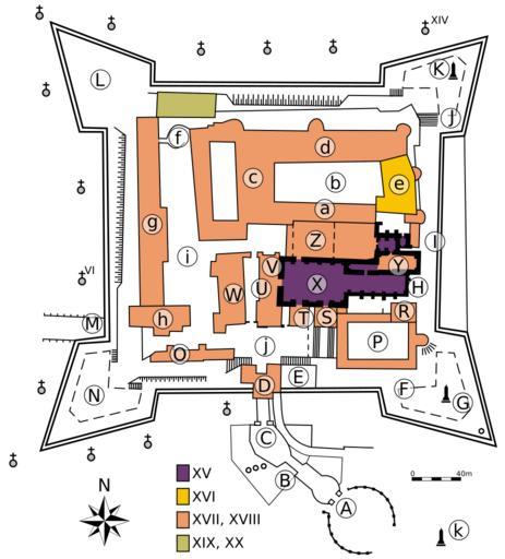 | Keywords: JasnaGora.svg Jasna Góra Monastery Częstochowa Poland Own 2008-04-14 Reytan svg version by Actam wikitable - Letter Polski English - A Brama Lubomirskich The Lubomirskis' Gate - B Brama Matki Boskiej Królowej Polski The Black Madonna the Queen of Poland Gate - C Brama Matki Boskiej Bolesnej - D Brama wałowa Bramy Jagiellońskie Brama wałowa the Jagiellonian Gate - E Sala Maryjna The Hall of the Virgin Mary - F Bastion królewski bastion Potockich The Royal Bastion The Potockis' bastion - G Pomnik o A Kordeckiego Statue of Augustyn Kordecki - H Skarbiec Vault - I Ołtarz przed szczytem Altar built on the front wall of fortification - J Bastion Św Trójcy bastion Szaniawskich The Holy Trinity's bastion the Szaniawskis' bastion - K Pomnik Jana Pawła II Statue of John Paul II - L Bastion Morsztynów The Morsztyn's bastion - M Brama Jana Pawła II brama wjazdowa The John Paul II Gate the entrance gate - N Bastion św Barbary bastion Lubomirskich The St Barbara's bastion The Lubomirskis' bastion - O Domy Muzykantów Musicians' apartments - P Wieczernik The Cenacle - R Wirydarz The pleasure garden - S Kaplica Jabłonowskich kaplica Serca Pana Jezusa The Jabłonowskis' chapel the Jesus' Heart chapel - T Kaplica Denhoffów kaplica św Pawła Pierwszego Pustelnika The Denhoff's chapel the St Paul the Hermit's chapel - U Wejście na wieżę The tower entrance - V Kaplica św Antoniego The St Anthony's chapel - W Pokoje Królewskie The Royal Rooms - X Bazylika The Basilica - Y Zakrystia The sacristy - Z Kaplica MB Częstochowskiej The Black Madonna of Częstochowa Chapel - a Sala Rycerska The Knight's Hall - b Wirydarz klasztorny The pleasure garden - c Refektarz i biblioteka The refectory and the Library - d e Klasztor Monastery - f Studnia Water well - g Muzeum 600-lecia The Museum of the 600th anniversary - h Arsenał The Arsenal - i Dziedziniec gospodarczy Household courtyard - j Dziedziniec główny Main courtyard - k Pomnik kard Stefana Wyszyńskiego Statue of Stefan Wyszyński Svg info Inkscape ValidSVG Floor plans of monasteries Jasna Góra SVG buildings |