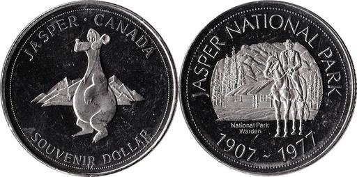Keywords: Jasper Souvenir 1977.jpg en A souvenir token from Jasper Alberta 2016-03-26 own Awmcphee other versions cc-zero Jasper Alberta Token coins in Canada Souvenir tokens