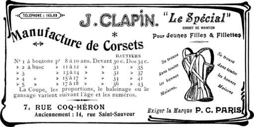 | Keywords: JClapinLeSpecialCorsetDeMaintien.png J Clapin; Le Spécial Corset De Maintien Pour Jeunes Filles Fillettes; Se trouves dans toutes les bonnes Maisons Les Dessous Élégants; N° 8 page II AOUT 1904 Anonymous PD <TABLE BORDER 0 ><TR><TD> <br>N° </TD><TD> - </TD><TD> HAUTEURS <br>Devant </TD><TD> HAUTEURS <br>Dos </TD></TR><TR><TD> 1 à boutons </TD><TD> p<sup>r</sup> 8 à 10 ans </TD><TD> 30 c </TD><TD> 34 c </TD></TR><TR><TD> 2 à busc </TD><TD> p<sup>r</sup> 11 à 12 ans </TD><TD> 31 c </TD><TD> 35 c </TD></TR><TR><TD> 3 à busc </TD><TD> p<sup>r</sup> 13 à 14 ans </TD><TD> 31 c </TD><TD> 37 c </TD></TR><TR><TD> 4 à busc </TD><TD> p<sup>r</sup> 15 à 17 ans </TD><TD> 34 c </TD><TD> 41 c </TD></TR><TR><TD> 5 à busc </TD><TD> p<sup>r</sup> 17 à 18 ans </TD><TD> 36 c </TD><TD> 43 c </TD></TR> </TABLE> La Coupe les proportions le baleinage ou le gansage varient suivant l'age et les numéros PD-old Dessous Elegants 1904 Corset advertisements Shoulder corsets Corsets for children |