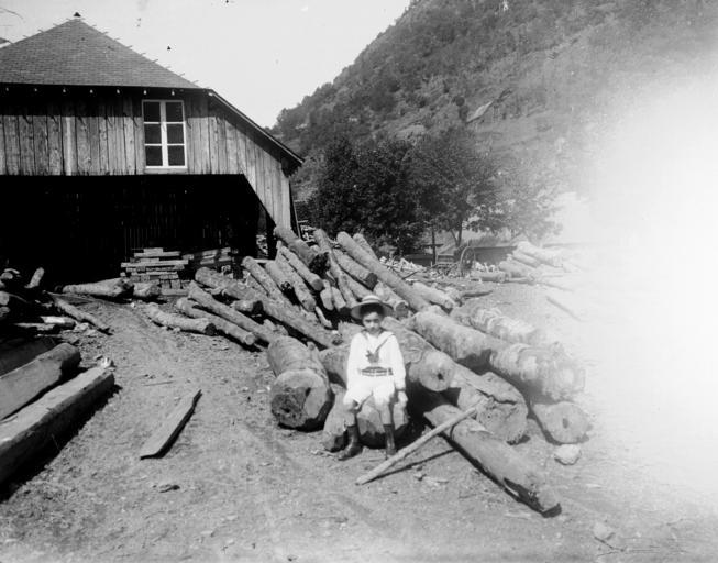 -- Bâtiment -- Usine -- Scierie -- Toit -- Ardoise -- Mur -- Bois -- Tronc -- Enfant -- Garçon -- Costume d'enfant -- Chapeau de paille -- Culotte courte -- Charrette