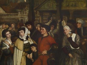 Keywords: Jean August Hendrik Leys - The Edict-s- of Charles V - Walters 37123 - Detail B.jpg Baron Leys was regarded as Belgium's foremost artist in the mid 19th century About 1851 he adopted a deliberately archaizing style resulting in part from a visit to Germany in 1852 This scene is set in the artist's native Antwerp identifiable because of the famous church spire in the distance Between 1520 and 1550 Charles V emperor of the Holy Roman Empire issued 11 edicts making the practice of Protestantism a crime punishable by death Antwerp served as a major center of learning and finance that had attracted many foreigners especially Jews and Protestants ca 1861 oil on panel cm 138 245 ; Framed cm 182 9 280 7 12 7 accession number 37 123 7985 Comte W de Bourgade date and mode of acquisition unknown Comte de Liedekerke-Beaufort Dinant date and mode of acquisition unknown Charles Deschamps October 24 1883 mode of acquisition unknown William T Walters Baltimore October 1883 by purchase Henry Walters city Baltimore Walters Art Museum Henry Walters Acquired by William T Walters 1883 Label Paper sticker on reverse Exhibition Historique de l'art Belge / Nom de possesseur du tableau Cte W de Bourgade / Subjet de l'oeuvre Publication des edits de Charles Quint / Valeur / Nom de l'auteur Bon Leys Salute to Belgium place of origin Picardy Walters Art Museum license 2D Salute to Belgium The Edicts of Charles V Media contributed by the Walters Art Museum needs category review Paintings in the Walters Art Museum |