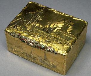Keywords: Jean George - Snuffbox - Walters 5795 - View A.jpg In western Europe during the 18th century small boxes ostensibly snuff containers executed in gold and other precious materials were among the most prized luxury products In this example the master goldsmith Jean George worked in several colors of gold the differences being achieved by using different alloys a technique known as quatre couleur The images on the six surfaces of the box recall the harbor scenes of the painter Joseph Vernet 1714-1789 between 1758 1759 gold diamonds and emeralds cm 4 6 4 accession number 57 95 26464 Sir Jacob Astley 1797-1859 6th Baronet 16th Baron Hastings Norfolk England Sir George Manners Astley 1857-1904 10th Baronet 20th Baron Hastings England by inheritance Harding London Henry Walters Baltimore Walters Art Museum Henry Walters Acquired by Henry Walters Objects of Vertu Precious Works of the Eighteenth Century The Walters Art Gallery Baltimore 1984 place of origin Paris France Walters Art Museum license Jean George Baron Hastings Snuffboxs in the Walters Art Museum Works after Joseph Vernet Snuffboxes from France Gold boxes 1750s art |