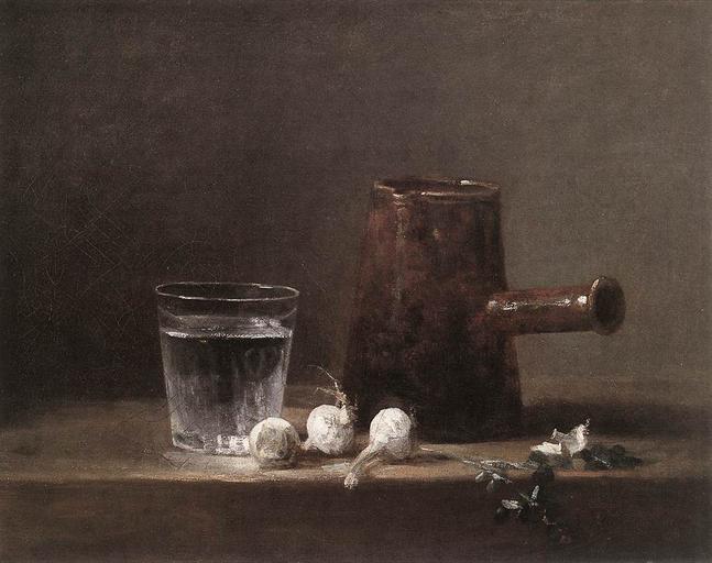 | Keywords: Jean Siméon Chardin - Water Glass and Jug - WGA04775.jpg Artwork Creator Jean Siméon Chardin ca 1760 Oil on canvas size cm 32 5 41 Institution Carnegie Museum of Art object history credit line accession number WGA link 4775 http //www wga hu/art/c/chardin/2/08waterj jpg http //www wga hu/html/c/chardin/2/08waterj html PD-old-100 painting still-life French 1701-1750 Still life paintings by Jean Siméon Chardin Still-life paintings of glassware Chardin Paintings in the Carnegie Museum of Art WGA form painting WGA type still-life WGA School French WGA time period 1701-1750 Glasses of water 1760s paintings from France 1760s still life paintings 1760s oil on canvas paintings in the United States 17th-century still life paintings in the United States Jugs in art Garlic in art Pottery in French painting |