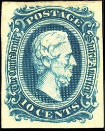 Keywords: Jefferson Davis 1863 10c.jpg en Confederate postage stamp Jefferson Davis 1863 issue 10c Type I<br/>This is the same engraving as the Frame Line issue but without the frame lines There were approximately 23 800 000 stamps printed from two plates each with two panes of one hundred CSA Post Office<br/>http //arago si edu/index asp con 1 cmd 1 mode tid 2027913 Smithsonian National Postal Museum<br/>Photo image obtained/rendered by Gwillhickers CSA Post Office 1863 PD-old-100 Stamps of the Confederate States of America Jefferson Davis on stamps Stamps of the American Civil War |