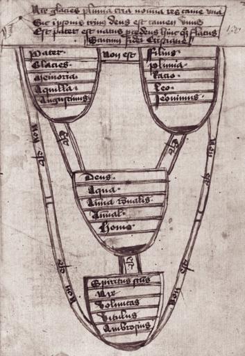 Keywords: Jerome-of-Prague Scutum-fidei-Christianae 15thc.png Version of the Scutum Fidei or Shield of the Trinity diagram here captioned Scutum fidei Christianae or Shield of the Christian faith ; the general diagram has been around since the early 13th century but this particular variant was devised by Jerome of Prague ca the early 15th century There are four nodes and six connecting links as in the standard diagram but each node has five separate captions so that this illustration contains five parallel diagrams all with the same overall central-positive / peripheral-negative structure ;1st diagram standard Scutum Fidei or Shield of the Trinity diagram with Deus God in center Pater Father Filius Son Spiritus sanctus Holy Spirit in outer nodes See article en Shield of the Trinity for details ;2nd diagram aqua water in center glacies ice pluvia rain nix snow in outer nodes ;3rd diagram anima soul in center memoria memory ratio reason voluntas will in outer nodes ;4th diagram animal animal in center aquilla eagle leo lion vitulus calf in outer nodes ;5th diagram homo man human in center Augustinus Augustine Jeronimus Jerome Ambrosius Ambrose in outer nodes Versions of this illustration in other sources apparently have intellectus in place of ratio asinus in place of vitulus rationalis anima in place of anima rationalis and/or correct spelling aquila in place of typo aquilla etc Some of the analogies to the Trinity in the second through fifth diagrams are theologically controversial and were part of the evidence for heresy accusations against Jerome of Prague Excerpt from manuscript MS Prague NK ČR V E 28 folio 130r held by the National Library of the Czech Republic as reproduced in the article Scutum fidei christianae The Depiction and Explanation of the Shield of Faith in the Realistic Teaching of Jerome of Prague in the Context of His Interpretation of the Trinity by Ota Pavlíček in The Bohemian Reformation and Religious Practice 9 2014 edited by Zdenek V David and David R Holeton; see http //brrp org/vol9 html http //brrp org/vol9contents html http //brrp org/proceedings/brrp9/pavlicek pdf ISBN 978-80-7007-416-9 15th-century manuscript Jerome of Prague's original diagram was created before 1410 Unknown 15th-century scribe based on works of Jerome of Prague PD-old-100 Jeroným Pražský Shield of the Trinity |