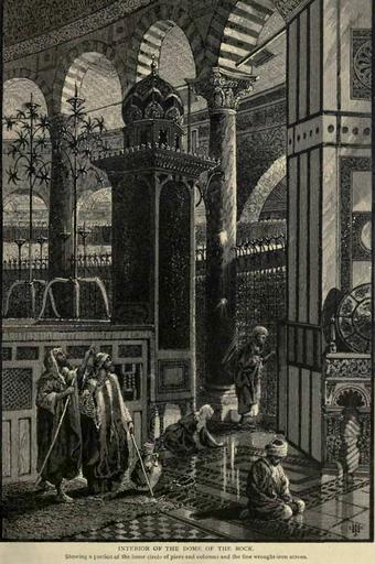 | Keywords: Jerusalem dome of rock 1880.jpg smallcaps interior of the dome of the rock <br>Showing a portion of the inner circle of piers and columns and the fine wrought-iron screen Picturesque Palestine Sinai and Egypt Vol I p 59 New York D Appleton Co 1881 An engraving based on a sketch or watercolor by J D Woodward 1877 “79 PD-old-100 PD-old Historic Images of the Dome of Rock Picturesque Palestine Sinai and Egypt Jerusalem in the 1870s John Douglas Woodward | ||||