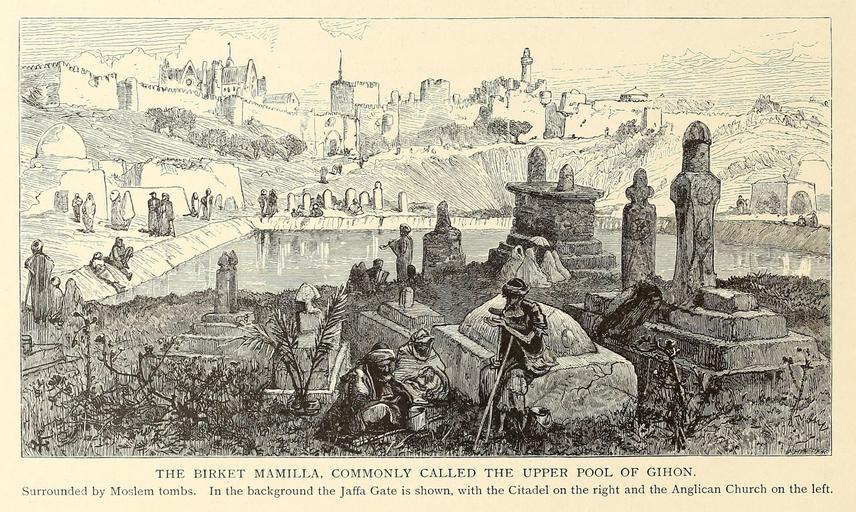 | Keywords: Jerusalem mamilla pool 1880.jpg  smallcaps the birket mamilla commonly called the upper pool of gihon <br>Surrounded by Moslem tombs In the background the Jaffa Gate is shown with the Citadel on the right and the Anglican Church on the left https //archive org/stream/picturesquepales01wils_0 page/5/mode/2up Picturesque Palestine Sinai and Egypt Vol I https //archive org/stream/picturesquepales01wils_0 page/102/mode/2up p 102 New York D Appleton Co 1881 Harry Fenn PD-US PD-100 PD-100 Mamilla pool Mamilla Cemetery Jerusalem in art Picturesque Palestine Sinai and Egypt Harry Fenn Graves in art Cripples in art Jaffa Gate Jerusalem in the 1870s ImageNote 1 352 114 51 61 980 605 2 Jaffa Gate ImageNoteEnd 1 ImageNote 2 162 38 180 102 980 605 2 Anglican Church at Jerusalem ImageNoteEnd 2 ImageNote 3 538 27 129 97 980 605 2 Citadel of Jerusalem ImageNoteEnd 3 ImageNote 4 854 305 107 127 2307 1380 2 Jaffa Gate ImageNoteEnd 4 ImageNote 5 427 161 340 173 2307 1380 2 Anglican Church of Jerusalem ImageNoteEnd 5 ImageNote 6 1246 127 265 230 2307 1380 2 Jerusalem Citadel<br>or<br>Tower of David ImageNoteEnd 6 ImageNote 7 707 637 164 124 2307 1380 2 Upper Pool of Gihon<br>or<br>Birket Mamilla<br>or<br>Mamilla Pool ImageNoteEnd 7  |