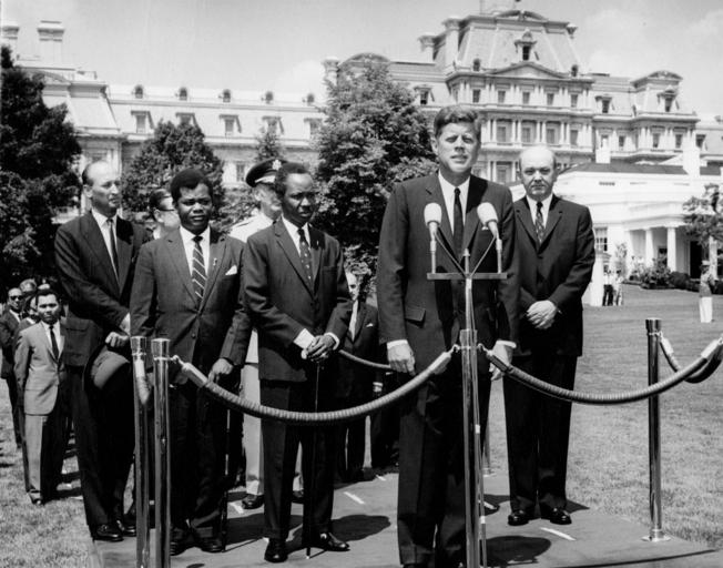 Keywords: JFKWHP-AR8022-H.jpg en 15 July 1963 President John F Kennedy attends the arrival ceremony for President of Tanganyika Julius K Nyerere Photograph includes L-R Chief of Protocol Angier Biddle Duke Tanganyikan Minister of External Affairs Oscar Kambona President Nyerere President Kennedy and Secretary of State Dean Rusk South Lawn White House Washington D C Please credit Abbie Rowe White House Photographs John F Kennedy Presidential Library and Museum Boston 1963-07-15 John F Kennedy Presidential Library and Museum Boston http //www jfklibrary org Abbie Rowe White House Photographs other versions PD-USGov Relations of Tanzania and the United States in the 1960s Julius Nyerere Oscar Kambona Eisenhower Executive Office Building Dean Rusk Angier Biddle Duke |