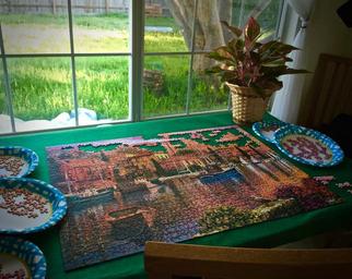 MAKE A MEME View Large Image jigsaw puzzles process jigsaw puzzle puzzle pieces games green orange paper plates blue in process plants table window relaxation houseplant home interior