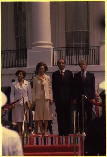Keywords: Jimmy Carter and Andres Perez President of Venezuela during a state arrival ceremony. - NARA - 175327.tif Scope and content General notes 175327 Local identifier President 1977-1981 Carter White House Staff Photographers 01/20/1977 - 01/20/1981 Jimmy Carter Library NLJC 441 Freedom Parkway Atlanta GA 30307-1498 1977-06-28 Record group Collection JC-WHSP Carter White House Photographs Collection 01/20/1977 - 01/22/1981 Record group ARC 1120 Carter White House Photographs Presidential compiled 01/20/1977 - 01/22/1981 Series ARC 173341 File unit State Arrival for the President of Venezuela 06/28/1977 - 06/28/1977 File unit ARC 175326 Variant control numbers NAIL Control Number NLC-WHSP-C-01896-15 yes Other versions NARA-cooperation PD-USGov Jimmy Carter with national leaders Rosalynn and Jimmy Carter State visits Carlos Andrés Pérez Blanca Rodríguez de Pérez Relations of the United States and Venezuela |