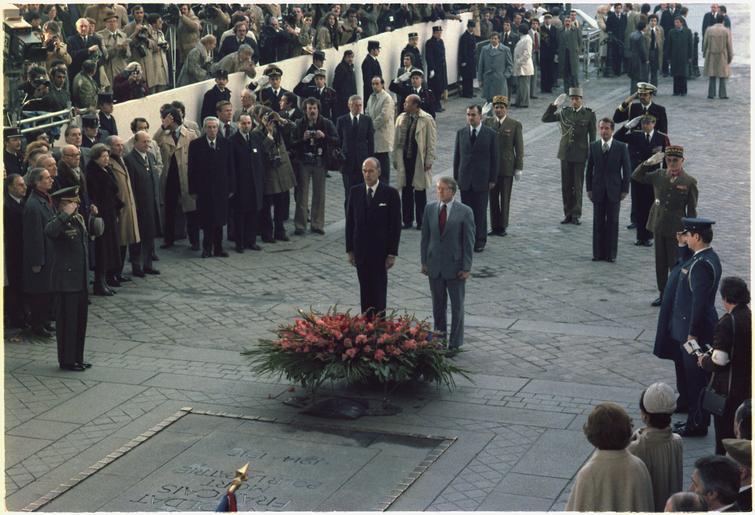 | Keywords: Jimmy Carter and Giscard d'Estaing participate in a wreathlaying ceremony at the Tomb of the Unknown Soldier at the... - NARA - 177500.tif Scope and content General notes 177500 Local identifier President 1977-1981 Carter White House Staff Photographers 01/20/1977 - 01/20/1981 Jimmy Carter Library NLJC 441 Freedom Parkway Atlanta GA 30307-1498 1978-01-04 Record group Collection JC-WHSP Carter White House Photographs Collection 01/20/1977 - 01/22/1981 Record group ARC 1120 Carter White House Photographs Presidential compiled 01/20/1977 - 01/22/1981 Series ARC 173341 File unit Arrival Orly Paris Arc de Triumph ceremony 01/05/1978 - 01/05/1978 File unit ARC 177499 Variant control numbers NAIL Control Number NLC-WHSP-C-03917-23A yes Other versions NARA-cooperation PD-USGov Jimmy Carter and Valéry Giscard d'Estaing State visits Memorial wreaths Tomb of the Unknown Soldier in Paris 1978 events in Paris January 1978 in France Arc de Triomphe de l'Étoile in the 1970s |