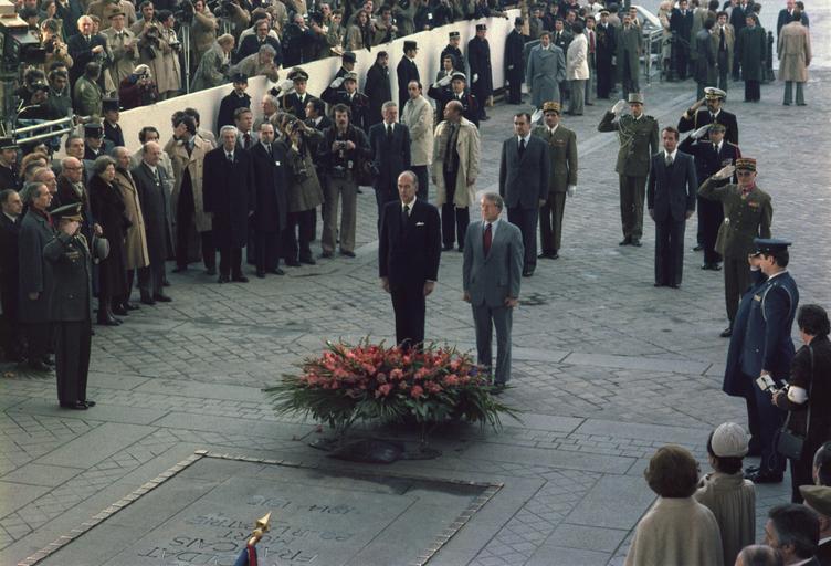 | Keywords: Jimmy Carter and Giscard d'Estaing participate in a wreathlaying ceremony at the Tomb of the Unknown Soldier at the... - NARA - 177500.jpg Scope and content General notes 177500 Local identifier President 1977-1981 Carter White House Staff Photographers 01/20/1977 - 01/20/1981 Jimmy Carter Library NLJC 441 Freedom Parkway Atlanta GA 30307-1498 1978-01-04 Record group Collection JC-WHSP Carter White House Photographs Collection 01/20/1977 - 01/22/1981 Record group ARC 1120 Carter White House Photographs Presidential compiled 01/20/1977 - 01/22/1981 Series ARC 173341 File unit Arrival Orly Paris Arc de Triumph ceremony 01/05/1978 - 01/05/1978 File unit ARC 177499 Variant control numbers NAIL Control Number NLC-WHSP-C-03917-23A yes Other versions NARA-cooperation PD-USGov Jimmy Carter and Valéry Giscard d'Estaing State visits Memorial wreaths Tomb of the Unknown Soldier in Paris 1978 events in Paris January 1978 in France Arc de Triomphe de l'Étoile in the 1970s |