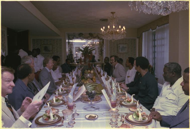 Keywords: Jimmy Carter and President William Tolbert of Liberia participate in a working luncheon. - NARA - 178682.tif Scope and content General notes 178682 Local identifier President 1977-1981 Carter White House Staff Photographers 01/20/1977 - 01/20/1981 Jimmy Carter Library NLJC 441 Freedom Parkway Atlanta GA 30307-1498 1978-04-03 Record group Collection JC-WHSP Carter White House Photographs Collection 01/20/1977 - 01/22/1981 Record group ARC 1120 Carter White House Photographs Presidential compiled 01/20/1977 - 01/22/1981 Series ARC 173341 File unit Jimmy Carter - Lagos Nigeria 04/03/1978 - 04/03/1978 File unit ARC 178681 Variant control numbers NAIL Control Number NLC-WHSP-C-05017-16A yes Other versions NARA-cooperation PD-USGov William Tolbert Jimmy Carter with national leaders 1978 in Liberia |