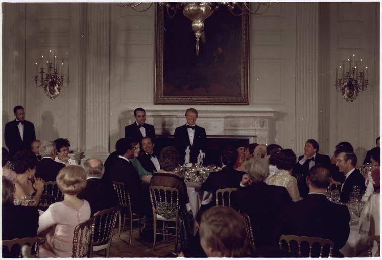 Keywords: Jimmy Carter toasts Andre Perez President of Venezuela during a state dinner. - NARA - 175338.tif Scope and content General notes 175338 Local identifier President 1977-1981 Carter White House Staff Photographers 01/20/1977 - 01/20/1981 Jimmy Carter Library NLJC 441 Freedom Parkway Atlanta GA 30307-1498 1977-06-28 Record group Collection JC-WHSP Carter White House Photographs Collection 01/20/1977 - 01/22/1981 Record group ARC 1120 Carter White House Photographs Presidential compiled 01/20/1977 - 01/22/1981 Series ARC 173341 File unit State Dinner for the President of Venezuela 06/28/1977 - 06/28/1977 File unit ARC 175337 Variant control numbers NAIL Control Number NLC-WHSP-C-01906-9 yes Other versions NARA-cooperation PD-USGov Carlos Andrés Pérez State dinners Jimmy Carter with national leaders Relations of the United States and Venezuela |