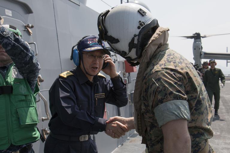| Keywords: JMSDF leadership greets a U.S. Marine Corps officer. (25936524954).jpg KUMAMOTO Japan April 19 2016 Japan Maritime Self-Defense Force Rear Adm Koji Manabe Escort Flotilla 3 Commander welcomes a senior Marine Corps officer from the 31st Marine Expeditionary Unit MEU aboard JS Hyuga DDH 181 as MV-22B Osprey aircrafts from Marine Medium Tilitrotor Squadron VMM 265 attached to the 31st MEU prepare to transport aid in support of the Government of Japan's relief efforts following earthquakes near Kumamoto The long-standing alliance between Japan and the U S allows U S military forces in Japan to provide rapid integrated support to the Japan Self-Defense Force and civil relief efforts U S Navy Photo by Mass Communication Specialist 3rd Class Gabriel B Kotico/Released 160419-N-AE545-232 Join the conversation http //www navy mil/viewGallery asp www navy mil/viewGallery asp http //www facebook com/USNavy www facebook com/USNavy http //www twitter com/USNavy www twitter com/USNavy http //navylive dodlive mil navylive dodlive mil http //pinterest com pinterest com https //plus google com plus google com https //www flickr com/photos/usnavy/25936524954/ JMSDF leadership greets a U S Marine Corps officer 2016-04-19 13 34 https //www flickr com/people/56594044 N06 Official U S Navy Page from United States of America MC3 Gabriel B Kotico/U S Navy Attribution License IPTC Caption-Abstract U S Navy Photo PD-USGov-Military-Navy Official U S Navy Imagery https //flickr com/photos/56594044 N06/25936524954 2016-04-20 15 31 20 cc-by-2 0 2016 Kumamoto earthquake relief efforts JS Hyƫga DDH-181 Photographs taken on 2016-04-19 United States Forces Japan 160419-N-AE545-232 Navy Files from the U S Navy Flickr stream |