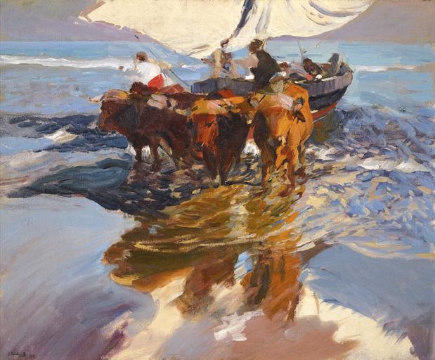 Keywords: Joaquín Sorolla y Bastida - Vuelta de la Pesca, Playa de Valencia (1908).jpg Artwork Creator Joaquín Sorolla 1908 oil canvas cm 90 110 object history Victor M Tyler New Haven Connecticut acquired at the Hispanic Society of America New York in 1909 <br/>Mrs Marion Barlow Pasadena 1872-1964; née Patterson Brooks; friends with the above and wife of Dr Walter Jarvis Barlow 1868-1937 <br/>Pasadena Art Museum Pasadena a gift from the above in 1946; Walter Jarvis Barlow Jr 1900-1965 was the eldest son of Walter and Marion Barlow and director of the Pasadena Art Museum from 1943-46 A noted linguist writer poet and critic he was also Assistant Director of the Otis Art Institute in Pasadena The Pasadena Art Museum became the The Norton Simon Museum of Art at Pasadena in March 1975 <br/>Deaccessioned from the above on 3 September 1969 and acquired by Maxwell Galleries San Francisco<br/>Edmund Peel Madrid<br/>Felix Estrada Saladich Barcelona until the early 1970s <br/>Acquired by the family of the late owner in the mid-1970s credit line exhibition history New York The Hispanic Society of America; Buffalo Fine Arts Academy; Boston Copley Society of Art Paintings by Joaquín Sorolla y Bastida exhibited by the Hispanic Society of America 1909 no 102 New York no 68 Buffalo Boston Valencia IVAM Centre Julio González; New York IBM Gallery; St Louis Art Museum; San Diego Museum of Art Joaquín Sorolla y Bastida 1989-90 no 49 Albuquerque The Albuquerque Museum; Dallas Meadows Museum; Prelude to Spanish Modernism Fortuny to Picasso 2005-06 no 41 J Sorolla B 1908 l ~ lower left signature / date BPS 1907 accession number http //www sothebys com/en/auctions/ecatalogue/2014/19th-century-european-paintings-l14102/lot 49 html Sotheby's London 10 December 2014 lot 49 PD-old-auto-1923 1923 DEFAULTSORT Sorolla; beach and cattle 1908; Sotheby's 2014 People at the beach in art by Joaquín Sorolla People with cattle in art by Joaquín Sorolla Paintings of boats by Joaquín Sorolla Images from Sotheby's