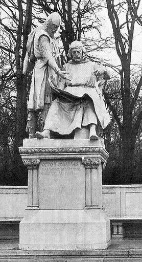 Keywords: Johann Otto Siegesallee2.JPG Ehemalige Siegesallee in Berlin mit dem Doppelstandbild Detail für die gemeinsam regierenden Brandenburger Markgrafen Johann I 1213 “1266 und Otto III ca 1215 “1267 Söhne von Albrecht II Bildhauer Max Baumbach Enthüllung 22 März 1900 Der auf einem Stein sitzende Johann I hat über seinen Knien die Urkunde ausgebreitet durch die Berlin und Cölln das Stadtrecht erhalten haben sollen Der jüngere Otto III steht neben ihm und weist mit einem Arm auf die Urkunde während der andere Arm auf einem Jagdspieß ruht Die jugendlichen Städtegründer sind hier als reife Männer dargestellt denn zwei Knabengestalten hätten den Gründungsakt einer späteren Weltstadt aus Sicht der gängigen Geschichtsinterpretation nicht angemessen zum Ausdruck bringen können The former Siegesallee in Berlin with the double statue detail commemorating the corulers of Brandenburg Margrave John I 1213 “1266 and Margrave Otto III ca 1215 “1267 sons of Albert II and grandchildren of Otto II Sculptor Max Baumbach The sculpture was unveiled on 22 March 1900 Spread across the knees of John I is the document granting town charters to Berlin and Cölln The younger Otto III stands beside him pointing to the charter with one arm while the other rests on a hunting spike The youthful city founders are portrayed here as mature men because in the view of contemporaries the significance of founding the later metropolis would not have been adequately manifested as an act of two youngsters Uta Lehnert Der Kaiser und die Siegesallee Réclame Royale Dietrich Reimer Verlag Berlin 1998 ISBN 3-496-01189-0 page 114 and 1899 1900 Max Baumbach and Karl Begas sculptors Siegesallee 05 Johann I + Otto III PD-old |