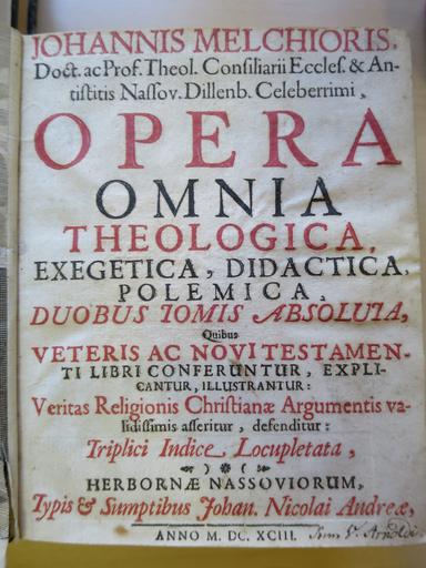 Keywords: Johannes Melchior Opera Omnia.JPG en Opera Omnia Theologica Exegetica Didactica Polemica Duobus Tomis Absoluta quibus Veteris ac Novi Testamenti libri conferuntur explicantur illustrantur Veritas Religionis Christianae ¦ Argumentis validissimis asseritur defenditur Triplici Indice Locupletata ¦ Johann Nicolai Andreae Herborn 1693 Signature AB 33 13 de Tietelblatt von Opera Omnia Theologica Exegetica Didactica Polemica Duobus Tomis Absoluta quibus Veteris ac Novi Testamenti libri conferuntur explicantur illustrantur Veritas Religionis Christianae ¦ Argumentis validissimis asseritur defenditur Triplici Indice Locupletata ¦ Johann Nicolai Andreae Herborn 1693 Signatur AB 33 13 own Reinhard Dietrich 2016-03-17 Cc-zero Johannes Melchior |