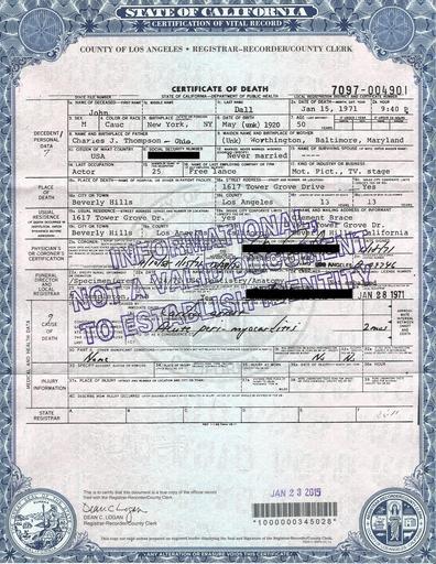 MAKE A MEME View Large Image John Dall - Death Certificate (1971).jpg en Death certificate of John Dall 1971-01-28 State of California - Department of Public Health County of Los Angeles - Registrar-Recorder/County Clerk other versions Custom license marker 2015 02 10 ...