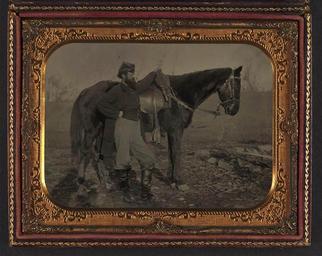 Keywords: library of congress libraryofcongress dc:identifier=http://hdl.loc.gov/loc.pnp/ppmsca.27549 dc:identifier=httphdllocgovlocpnpppmsca27549 xmlns:dc=http://purl.org/dc/elements/1.1/ xmlns:dc=httppurlorgdcelements11 u.s. civil war uscivilwar american civil war americancivilwar the civil war thecivilwar civil war civilwar war between the states warbetweenthestates united states of america unitedstatesofamerica u.s.a. usa the union theunion union the north thenorth yankee yankees soldier officer john e. cummins johnecummins john cummins johncummins cummins horse picture frame photo border [John E. Cummins of the 50th, 99th, and 185th Ohio Infantry regiments in Union uniform next to a horse] [between 1861 and 1865] 1 photograph : quarter-plate tintype, hand-colored ; 12.1 x 15.2 cm (case) Notes: Title devised by Library staff. Case: Leather grapes in vase with scroll embellishments. Cummins served as a Colonel, Lt. Colonel, and Brevet Brigadier General while with the 99th, 50th, and 185th Ohio Infantry Photo shows John E. Cummins, who enlisted at the age of 31 as a Lt. Colonel in the 99th Ohio Infantry. In December 1864 he was transferred to the 50th Ohio, and was then promoted to the rank of Colonel and transferred to the 185th Ohio in February 1865. In November 1865 Cummins was promoted to Brevet Brigadier General. He died in 1875 in Denver, Colorado. (Source: Matthew R. Gross and Elizabeth T. Lewin, 2010) Gift; Tom Liljenquist; 2010; (DLC/PP-2010:105). Published in: Horse equipment of the Civil War era. Fairfax, Virginia: SCS Publications, 2003, back cover. Subjects: Cummins, John E.,--1831-1875. United States.--Army.--Ohio Infantry Regiment, 99th (1862-1864)--People. United States.--Army.--Ohio Infantry Regiment, 50th (1862-1865)--People. United States.--Army.--Ohio Infantry Regiment, 185th (1865)--People. Soldiers--Union--1860-1870. Military uniforms--Union--1860-1870. Horses--1860-1870. United States--History--Civil War, 1861-1865--Military personnel--Union. United States--History--Civil War, 1861-1865--Animals--Union. Format: Portrait photographs--1860-1870. Tintypes--Hand-colored--1860-1870. Rights Info: No known restrictions on publication. Repository: Library of Congress, Prints and Photographs Division, Washington, D.C. 20540 USA, hdl.loc.gov/loc.pnp/pp.print Part Of: Ambrotype/Tintype filing series (Library of Congress) (DLC) 2010650518 Liljenquist Family collection (Library of Congress) (DLC) 2010650519 More information about this collection is available at hdl.loc.gov/loc.pnp/pp.lilj Persistent URL: hdl.loc.gov/loc.pnp/ppmsca.27549 Call Number: AMB/TIN no. 5043 [John E. Cummins of the 50th, 99th, and 185th Ohio Infantry regiments in Union uniform next to a horse] [between 1861 and 1865] 1 photograph : quarter-plate tintype, hand-colored ; 12.1 x 15.2 cm (case) Notes: Title devised by Library staff. Case: Leather grapes in vase with scroll embellishments. Cummins served as a Colonel, Lt. Colonel, and Brevet Brigadier General while with the 99th, 50th, and 185th Ohio Infantry Photo shows John E. Cummins, who enlisted at the age of 31 as a Lt. Colonel in the 99th Ohio Infantry. In December 1864 he was transferred to the 50th Ohio, and was then promoted to the rank of Colonel and transferred to the 185th Ohio in February 1865. In November 1865 Cummins was promoted to Brevet Brigadier General. He died in 1875 in Denver, Colorado. (Source: Matthew R. Gross and Elizabeth T. Lewin, 2010) Gift; Tom Liljenquist; 2010; (DLC/PP-2010:105). Published in: Horse equipment of the Civil War era. Fairfax, Virginia: SCS Publications, 2003, back cover. Subjects: Cummins, John E.,--1831-1875. United States.--Army.--Ohio Infantry Regiment, 99th (1862-1864)--People. United States.--Army.--Ohio Infantry Regiment, 50th (1862-1865)--People. United States.--Army.--Ohio Infantry Regiment, 185th (1865)--People. Soldiers--Union--1860-1870. Military uniforms--Union--1860-1870. Horses--1860-1870. United States--History--Civil War, 1861-1865--Military personnel--Union. United States--History--Civil War, 1861-1865--Animals--Union. Format: Portrait photographs--1860-1870. Tintypes--Hand-colored--1860-1870. Rights Info: No known restrictions on publication. Repository: Library of Congress, Prints and Photographs Division, Washington, D.C. 20540 USA, hdl.loc.gov/loc.pnp/pp.print Part Of: Ambrotype/Tintype filing series (Library of Congress) (DLC) 2010650518 Liljenquist Family collection (Library of Congress) (DLC) 2010650519 More information about this collection is available at hdl.loc.gov/loc.pnp/pp.lilj Persistent URL: hdl.loc.gov/loc.pnp/ppmsca.27549 Call Number: AMB/TIN no. 5043 |