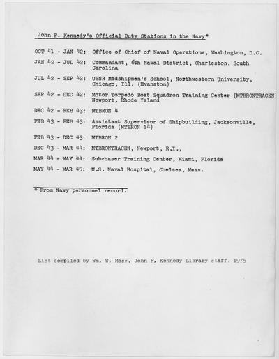 | Keywords: John F. Kennedy Navy Duty Stations - NARA - 192721.tif Scope and content List of John F Kennedy's duty stations in the Navy compiled by the Chief Archivist at the John F Kennedy Library General notes 192721 Local identifier Kennedy John F John Fitzgerald 1917-1963 John F Kennedy Library NLJFK Columbia Point Boston MA 02125-3398 1975 Record group Collection JFK-1 John F Kennedy Personal Papers 1917 - 1963 Record group ARC 595678 Boston Office Files compiled 1940 - 1956 Series ARC 192712 File unit John F Kennedy Personal Papers Boston Office 1940 - 1956 Personal Correspondence Navy Records 10/20/1941 - 05/16/1952 File unit ARC 192717 Variant control numbers NAIL Control Number NLK-JFKPP-BSTNOFFPERSO-NAVYRECORDS-JFKDUTYSTATIONS yes Other versions NARA-cooperation PD-USGov Documents related to John F Kennedy |
