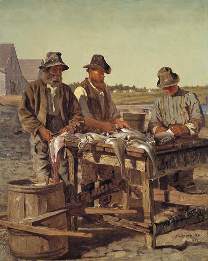| Keywords: John George Brown - Cleaning fish.jpg Artwork Creator John George Brown 1877 oil canvas in 24 5 19 5 Private collection accession number object history credit line exhibition history J G Brown N A / 1877 ~ lower right signature / date 1 source <br/>2 http //montgomerygallery com/art/artwork asp key 832 Montgomery Gallery San Francisco PD-old-auto-1923 1913 John George Brown 19th-century paintings of seaworkers and fishermen Cleaning fish Fish processing in the United States Fish in art Fishermen's clothing |