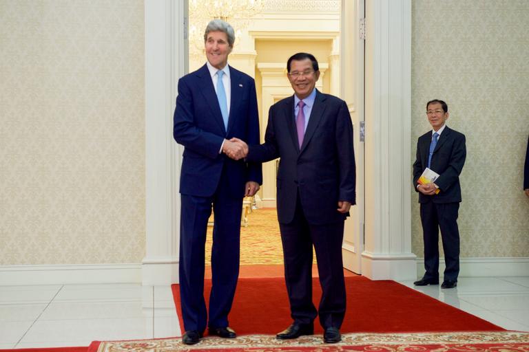 | Keywords: John Kerry meets with Cambodian Prime Minister Hun Sen.jpg  en U S Secretary of State John Kerry poses for photographers with Cambodian Prime Minister Hun Sen before a bilateral meeting on January 26 2016 at the Peace Palace in Phnom Penh Cambodia 2016-01-25 22 28 40 https //www flickr com/photos/statephotos/24251464529/ Secretary Kerry Poses for a Photo With Prime Minister Hun Sen State Department photo other versions PD-USGov John Kerry in January 2016 Hun Sen Foreign relations of the United States People of Phnom Penh International relations of Cambodia |