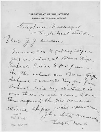 Keywords: John Little, Commander, Eagle Nest Station, to J.J. Duncan. - NARA - 284030.tif Scope and content General notes Request for child to attend Black Pipe Day School 284030 Local identifier Department of the Interior Office of Indian Affairs Pine Ridge Agency 1878 - 09/17/1947 NARA's Central Plains Region Kansas City NREA 400 West Pershing Road Kansas City MO 64108 other date ~ 1910 Record group Record Group 75 Records of the Bureau of Indian Affairs 1793 - 1999 Record group ARC 404 Correspondence of the Day School Inspector J J Duncan compiled 02/09/1910 - 09/06/1916 Series ARC 283922 File unit Correspondence of Day School Inspector J J Duncan February 9 1910 to December 13 1910 02/09/1910 - 12/13/1910 File unit ARC 284015 Variant control numbers NAIL Control Number NRE-75-169-C-15 yes Other versions NARA-cooperation PD-USGov Pine Ridge Day Schools |