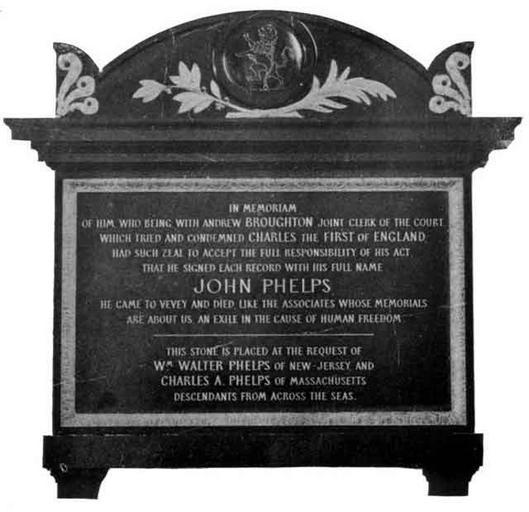 | Keywords: John phelps marker.jpg  Memorial to regicide John Phelps found in St Martin's Church Vevey Switzerland this black marble monument erected in 1882 though the liberality of the late Hon William Walter Phelps of Teaneck New Jersey and the Hon Charles A Phelps M D of Massachusetts William Walter Phelps was later the United States Ambassador to Prague Czechoslovakia The Phelps Family of America and Their English Ancestors Eagle Publishing Company of Pittsfield Massachusetts 1899 Judge Oliver Seymour Phelps and Andrew T Servin PD-old Parliamentary supporters in the English Civil War blurry Wall mounted church monuments Église réformée Saint-Martin de Vevey |