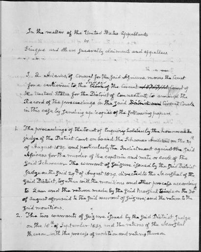 Keywords: John Quincy Adams' Request for Papers Relating to the Lower Court Trials of the Amistad Africans (Petition for... - NARA - 301671.tif Scope and content In the trial before the Supreme Court the Africans were represented by John Quincy Adams a former U S President and descendant of American revolutionaries Preparing for his appearance before the Court Adams requested papers from the lower courts one month before the proceedings opened For 8 1/2 hours the 73-year-old Adams passionately and eloquently defended the Africans' right to freedom on both legal and moral grounds referring to treaties prohibiting the slave trade and to the Declaration of Independence General notes Exhibit no 624 0199 Exhibit History American Originals December 1997 - June 1998 National Archives Rotunda Washington DC Exhibit No 624 0199 The Rights of All April 1987 - July 1987 Schomburg Center New York NY Exhibit No 1040 0003 301671 Local identifier Supreme Court of the United States 02/02/1790 - Archives I Reference Section Textual Archives Services Division NWCT1R National Archives Building 7th and Pennsylvania Avenue NW Washington DC 20408 1841 Record group Record Group 267 Records of the Supreme Court of the United States 1772 - 2007 Record group ARC 594 Appellate Jurisdiction Case Files compiled 1792 - 2006 Series ARC 301668 File unit United States Appellants v The Libellants and Claimants of the Schooner Amistad her tackle apparel and furniture together with her cargo and the Africans mentioned and described in the several libels and claims Appellees 1839 - 1841 File unit ARC 561022 Variant control numbers NAIL Control Number NWCTB-267-PI139E21-2161 CERT <br /> NAIL Control Number NWDT1-267-PI139E21-2161 CERT <br /> Other Identifier 02485<br /> This is the NARA internal exhibit tracking number yes Other versions <gallery> File John_Quincy_Adams'_Request_for_Papers_Relating_to_the_Lower_Court_Trials_of_the_Amistad_Africans_ Petition_for _-_NARA_-_301671 tif tif File John_Quincy_Adams'_Request_for_Papers_Relating_to_the_Lower_Court_Trials_of_the_Amistad_Africans_ Petition_for _-_NARA_-_301671 jpg jpg </gallery> NARA-cooperation PD-USGov John Quincy Adams 1841 in the United States Supreme Court of the United States cases NARA TIF images with categorized JPGs |