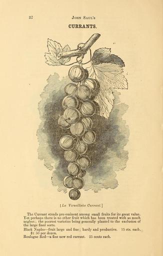 Keywords: John Saul's descriptive catalogue of fruits (16250337287).jpg 32 <br> John Saul's <br> CURRANTS <br> La Versaillaise Currant <br> The Currant stands pre-eminent among small fruits for its great value <br> Yet perhaps there is no other fruit which has been treated with as much <br> neglect; the poorest varieties being generally planted to the exclusion of <br> the large finer sorts <br> Black Naples ” fruit large and fine ; hardy and productive 15 cts each <br> i 50 per dozen <br> Boulogne Ked ” a fine new red currant 25 cents each 42388200 134051 66774 Page 32 Text http //www biodiversitylibrary org/page/42388200 1870 10 5962/bhl title 66774 Henry G Gilbert Nursery and Seed Trade Catalog Collection ; John Saul Firm Washington D C Biodiversity Heritage Library John Saul's descriptive catalogue of fruits Garden Stories Catalogs Fruit Nurseries Horticulture Plants Seeds U S Department of Agriculture National Agricultural Library bhl page 42388200 dc identifier http //biodiversitylibrary org/page/42388200 bhlGardenStories La Versaillaise currant BHLinbloom nurseries horticulture u s department of agriculture national agricultural library bhlgardenstories la versaillaise currant bhlinbloom Information field Flickr posted date ISOdate 2015-02-03 CC-BY-2 0 BioDivLibrary https //flickr com/photos/61021753 N02/16250337287 2015-08-24 06 50 46 cc-by-2 0 PD-old-70-1923 John Saul's descriptive catalogue of fruits Photos uploaded from Flickr by Fæ using a script |