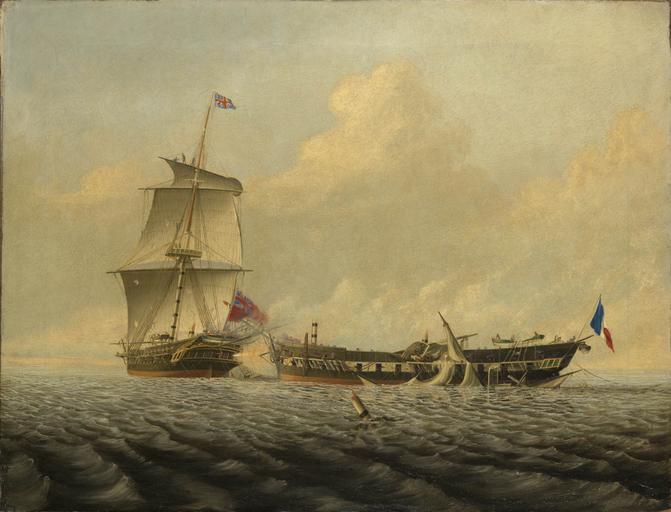 | Keywords: John Thomas Baines - Action between HMS 'Blanche' and the 'Pique', 5 January 1795.jpg 1830 02 oil canvas cm 58 5 76 2 National Maritime Museum Not on display object history credit line accession number BHC0478 http //collections nmm ac uk/collections/objects/11970 html collections nmm ac uk PD-old-100 Thomas Baines Paintings in the National Maritime Museum London 19th-century sailing ships in paintings 1830 paintings Sailing ships of the Royal Navy Damaged ships | ||||