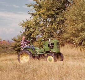 Keywords: JohnDeereModelLA.png en John Deere model LA tractor mowing a Windham Maine pasture Tractor was built in 1942 to replace a team of horses The two-cylinder engine was originally crank started but has been fitted with an electric starter with the battery box visible under the exhaust The sickle bar is mounted forward of the rear wheels and equipped with a covering shield to prevent damage by the over-riding wheel if the bar transitions to a trailing configuration upon encountering unsafe resistance to forward motion The tractor came equipped with a single 14-inch steel plow blade 1970-10 own Thewellman cc-zero Uploaded with UploadWizard John Deere letter series |