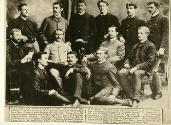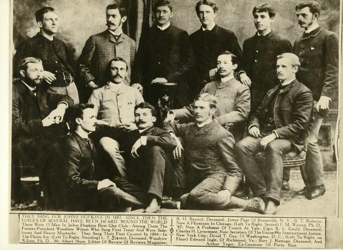 Keywords: johns hopkins glee club gleeclub monochrome Local Accession Number: 1220 Description: There were thirteen men in Johns Hopkins first Glee Club, among them was Woodrow Wilson who sang first tenor. He is second from left standing in the back with heavy sideburns and mustache. Photographer: Unknown Source: Enoch Pratt Free Library, Baltimore; Johns Hopkins University Size: 8x10, 8.5x11, 9.75x6.75 Medium: Photostat, Black and White Date: 1883 Local Accession Number: 1220 Description: There were thirteen men in Johns Hopkins first Glee Club, among them was Woodrow Wilson who sang first tenor. He is second from left standing in the back with heavy sideburns and mustache. Photographer: Unknown Source: Enoch Pratt Free Library, Baltimore; Johns Hopkins University Size: 8x10, 8.5x11, 9.75x6.75 Medium: Photostat, Black and White Date: 1883 |