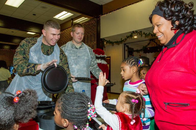 Keywords: Joint base volunteers, police and Toys for Tots help disadvantaged youth 131218-N-WY366-004.jpg en Marine Sgt Ryan Stitzel of Fleetwood Pa assigned to the Marine Barracks Washington exchanges smiles with a child as he serves her up a delicious warm lunch Military and civilian personnel and their families living or working at Joint Base Anacostia-Bolling JBAB volunteered and helped make the Christmas holiday season more joyful for nearly 300 youth in the District of Columbia ™s Ward 8 at a Disadvantaged Youth Holiday Party sponsored by the Metropolitan Police Department ™s Seventh District on Dec 18 The JBAB volunteers helped serve food to the children pass out gifts and help with the distribution of 80 bicycles donated to the Marine Corps Foundation ™s Toys for Tots program for the neediest of the children The JBAB-based U S Air Force rock band Max Impact kicked the event off with energetic holiday music that quickly had children on their feet and dancing Santa and Mrs Claus arrived at the event by police helicopter where they were met by Rudolph the Red-nosed Reindeer and Frosty the Snowman D C Mayor Vincent Gray stopped by to visit with the children and wish them a merry Christmas 2013-12-18 Lt Cmdr Jim Remington https //www dvidshub net/image/1142699 131218-N-WY366-004 2013-12-20 19 14 WASHINGTON DC US PD-USGov-Military-Navy Marine Barracks Washington D C Joint Base Anacostia-Bolling Images from DoD uploaded by Fæ