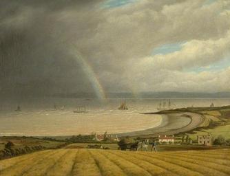 Keywords: Joseph Walter - A view from Portishead towards Wales.jpg Joseph Walter Joseph Walter 1783 “1856 This view looks in the opposite direction to Joseph Walter's 'A Ship Passing Portishead' and Portishead Point is at the end of the sweep of the bay There is an autumn storm approaching and vessels including a steam packet a merchant ship and many coastal craft hasten towards the mouth of the Avon and calmer waters 1832 oil canvas cm 48 2 63 5 Institution Bristol City Museum and Art Gallery object history gift from James Fuller Eberle 1921 credit line accession number K4551 http //www bbc co uk/arts/yourpaintings/paintings/a-view-from-portishead-towards-wales-189224 BBC Your Paintings PD-Art-100 Joseph Walter View from Portishead towards Wales Bristol City Museum and Art Gallery Portishead Somerset 19th-century sailing ships in paintings Images from BBC Your Paintings Rainbows in paintings 1830s paintings in the United Kingdom Agriculture in art 1830s landscape paintings |
