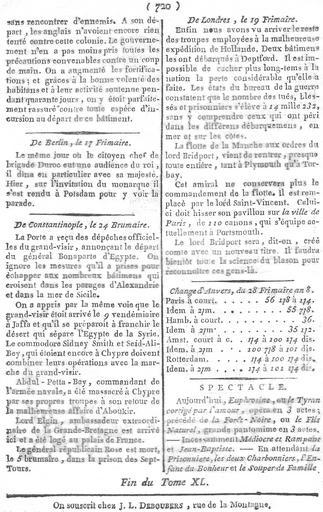 | Keywords: Journal de Bruxelles nr 90 1799 (720).jpg en Nr 90 of the Journal de Bruxelles during the French revolutionary republic occupation of Brussels in 1799 The French republican date is Décadi 30 Frimaire VIII Saturday 21 December 1799 This journal contains many dispatches with news all over Europe Page 720 1799-12-21 Journal de Bruxelles 1799 J L Deboubers File Journal de Bruxelles nr 90 1799 718 719 jpg custom PD-old-100-1923 Uploaded with UploadWizard Journal de Bruxelles nr 90 | ||||