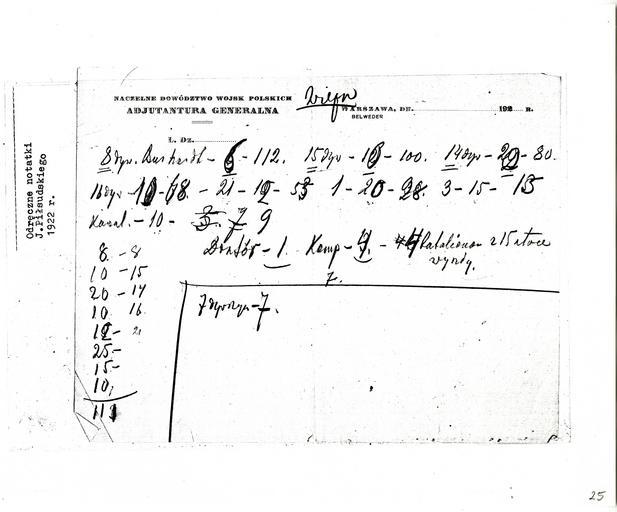| Keywords: Józef Piłsudski - Odręczne notatki Józefa Piłsudskiego - 701-001-025-025.jpg Piłsudski Institute document pl Odręczne notatki Józefa Piłsudskiego 1922 pl Odręczna notatka Józefa Piłsudskiego zawierająca liczbę jednostek polskich na Wieprzem pl Wieprz pl Dataset Dowbór-Muśnicki 1922 701/1/25/25 701 180/1626 1727 Archiwum Józefa Piłsudskiego 1 PD-old-auto-unpublished 1935 yes Collections of Józef Piłsudski Institute of America from 1922 Józef Piłsudski in 1922 Writings of Józef Piłsudski | ||||