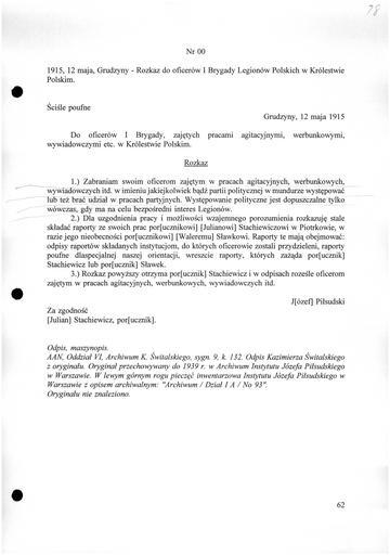 | Keywords: Józef Piłsudski - Rozkaz do oficerów I Brygady Legionów Polskich w Królestwie - 701-001-100-078.jpg  Piłsudski Institute document pl Rozkaz do oficerów I Brygady Legionów Polskich w Królestwie 1915-05-12 pl Rozkaz do oficerów I Brygady Legionów Polskich w Królestwie pl Legiony; Józef Piłsudski - listy pl Other Stachiewicz Julian <br/> Sławek Grudzyny <br/> Piotrków 701/1/100/78 701 180/3054 3555 Archiwum Józefa Piłsudskiego 1 PD-old-auto-unpublished 1935 yes Collections of Józef Piłsudski Institute of America from 1915 Józef Piłsudski in 1915 Writings of Józef Piłsudski Military documents of Second Polish Republic |