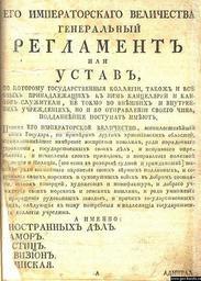 | Keywords: Генеральный регламент.jpeg ru Гене альный егламент или устав по кото ому госуда ственные коллегии також и все оных п инадлежащих к ним канцеля ий и конто служители не токмо во внешних и внут енних уч еждениях но и во отп авлении своего чина подданнейше поступать имею Гене альный егламент Peter I of Russia 1720-03-10 cc-zero Documents in Russian Documents of the Russian Empire 1720 in Russia Legal history of Russia Government of Russia | ||||