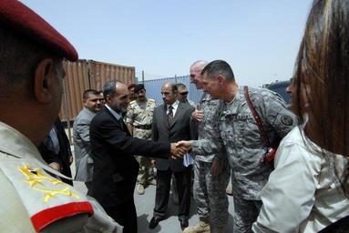 | Keywords: Judges Conference DVIDS193638.jpg en Brig Gen William G Beard greets judges from the Central Criminal Court Iraq as they arrive to participate in a Judges Training Conference at Camp Victory near Baghdad Iraq Aug 4 The conference is for judges to become more familiar with how coalition forces handle and process forensic evidence and how that evidence can be incorporated into their courtrooms 2009-08-04 https //www dvidshub net/image/193638 090804-N-+++++-007 2009-08-09 05 15 BAGHDAD IQ PD-USGov-Military-Navy Camp Victory Images from DoD uploaded by Fæ William G Beard |