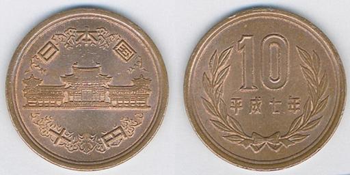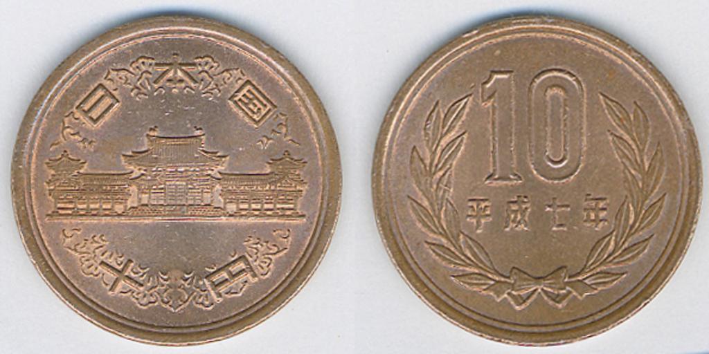 Keywords: JuEnDamaBothSidesWP.jpg 10 Yen coin of Japan Left Inscription 日 国 Nippon-koku 十円 Ten yen Design Byodoin a Buddhist temple in Uji Kyoto Prefecture Japan Right Inscription 10 value of coin in yen 平成七年 The year Heisei 7 I scanned this coin One coin two scans 2005-09-03 own assumed Fg2 See also Image JuEnDamaByodoinWP jpg Image JuEnDamaEvergreenTreeWP jpg 10 yen coins Phoenix Hall Byodo-in in art |