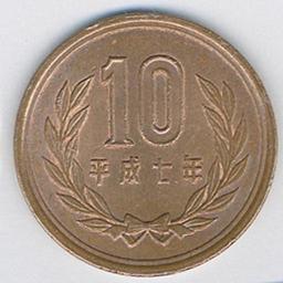 Keywords: JuEnDamaEvergreenTreeWP.jpg 10 Yen coin of Japan Inscription 10 value of coin in yen 平成七年 The year Heisei 7 Design Evergreen tree I scanned this coin 2005-09-03 own assumed Fg2 See also Image JuEnDamaByodoinWP jpg Image JuEnDamaBothSidesWP jpg 10 yen coins